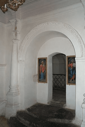 Попасть внутрь пещерного храма можно через кирпичную пристройку с односкатной крышей. с северной стороны Ильинской церкви. И пусть вас не смущает несоответствие внешнего вида здания входу в знаменитый храм. Внутри все по-другому. Так, интерьер “первой” церкви Антония Печерского — представляет ряд простых, но утонченных в архитектурном смысле помещений. И хотя бабинец и неф храма находятся над поверхностью земли, алтарь в толще скалы объясняет почему он “пещерный”.